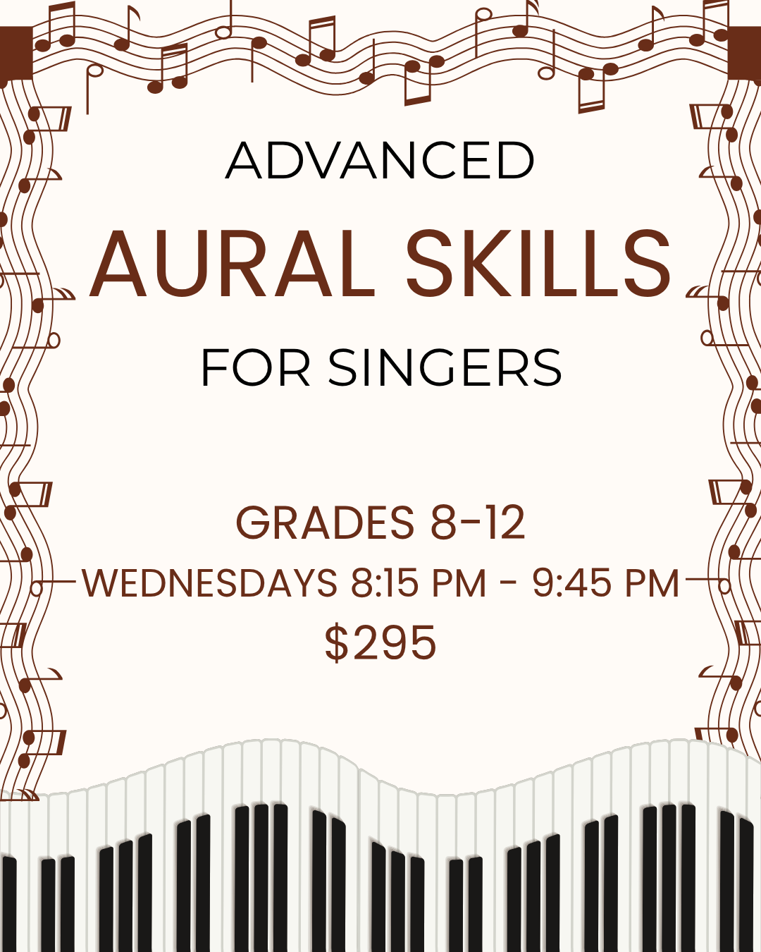 Ascend to new heights in your musical journey. Building upon the foundation of Advanced Music Theory for Singers, this capstone course transforms theoretical knowledge into practical mastery. Designed for advanced students ready to refine every aspect of their musicianship, Advanced Aural Skills provides the final layer of training for those pursuing excellence in performance, composition, or musical study. Students will continue to develop their sight-reading (now expanding into minor keys), rhythmic fluency, and piano “play and sing” technique, while engaging in bi-weekly intensive workshops that elevate the experience beyond traditional classroom study. In these workshops, students will explore advanced dictation exercises - both melodic and rhythmic - and compose their own musical excerpts to share and analyze with peers.